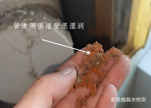 經檢測完成后將上圖墻壁檢修口打開發(fā)現墻壁含水量很高如下圖,完全證實了我們的檢驗準確性,
