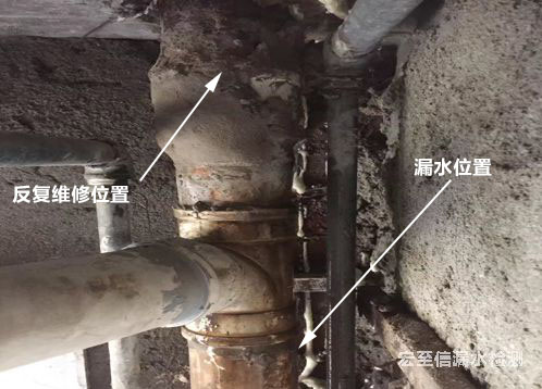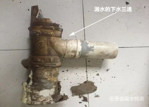 漏水原因描述:嶗山區(qū)??诼芬挥脩舴磻?yīng)下水管總是漏水處理過多次依然沒有解決漏水問題,我們上面對該用戶衛(wèi)生間漏水問題進行了詳細檢測,發(fā)現(xiàn)該用戶下水管漏水位置不僅僅是之前處理的一處,下水管三通下口在瓷磚內(nèi)部的位置也存在漏水問題。